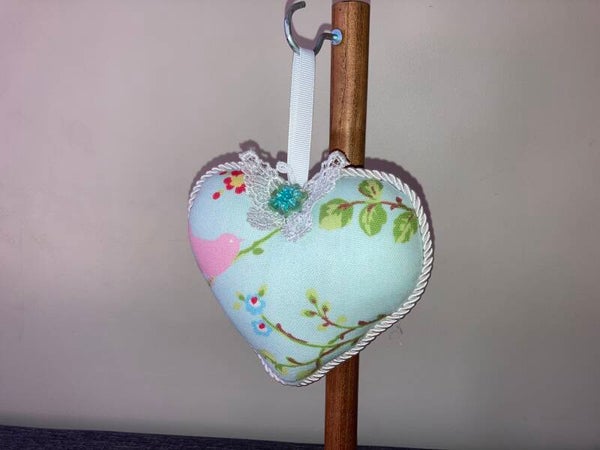 Pink Bird, pale blue floral Craft Fabric Heart, infused with Lavender. Decorative with designer fabric, with loop for hanging.